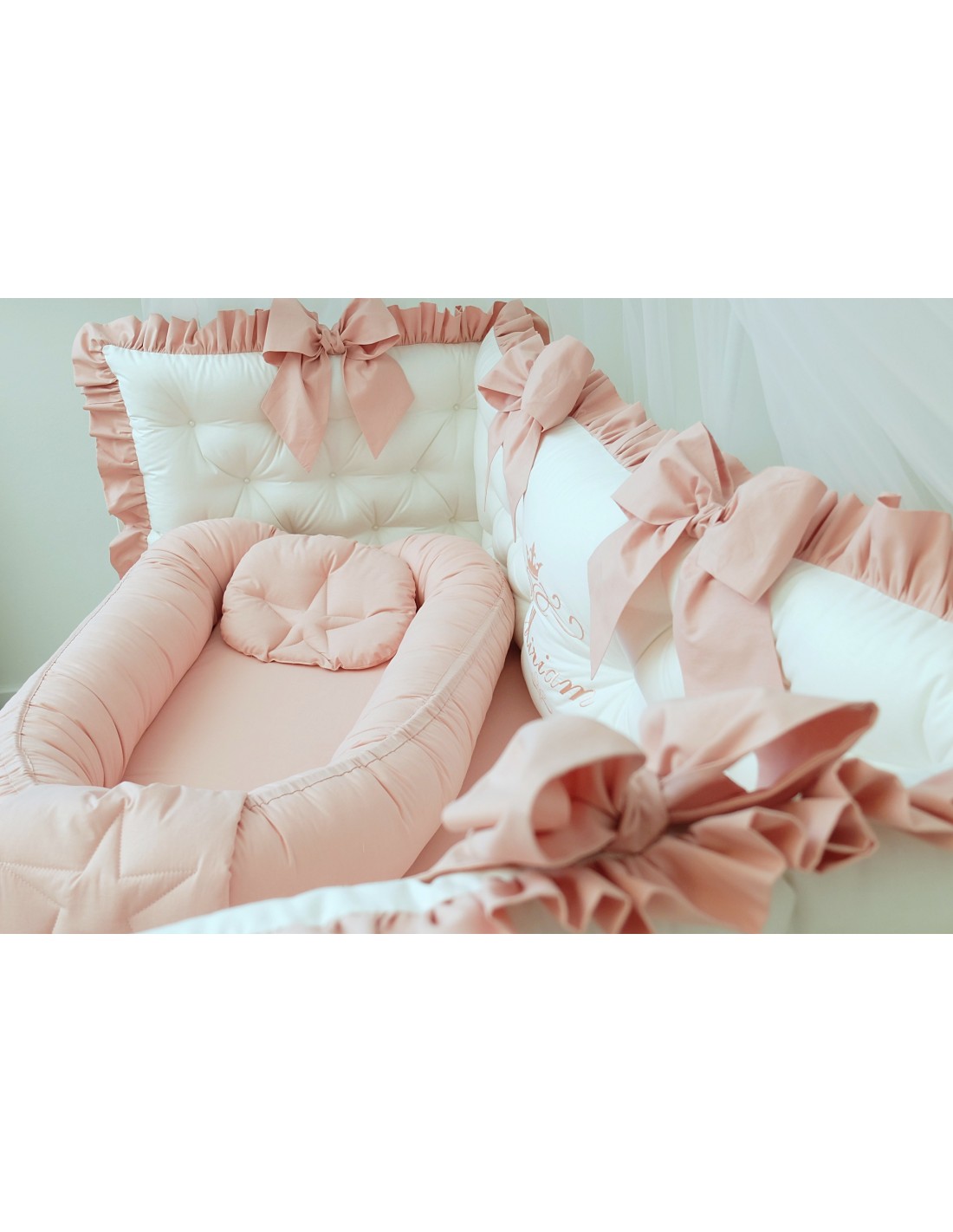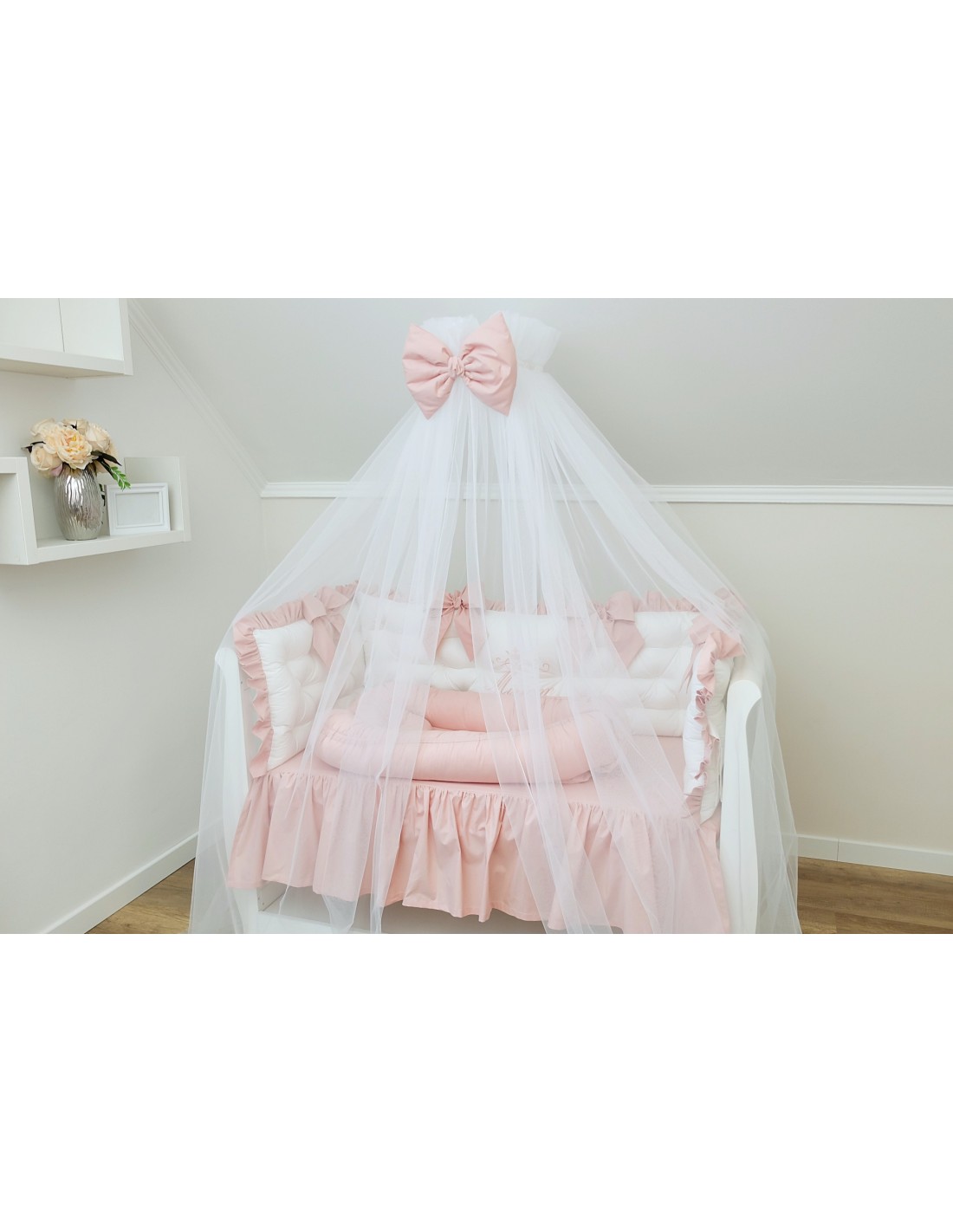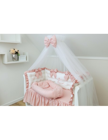 Setul de aparatori, baby nest, cearceaf cu volane si baldachin este tot ce ai nevoie pentru a creea o ambianta placuta in camera bebelusului tau.